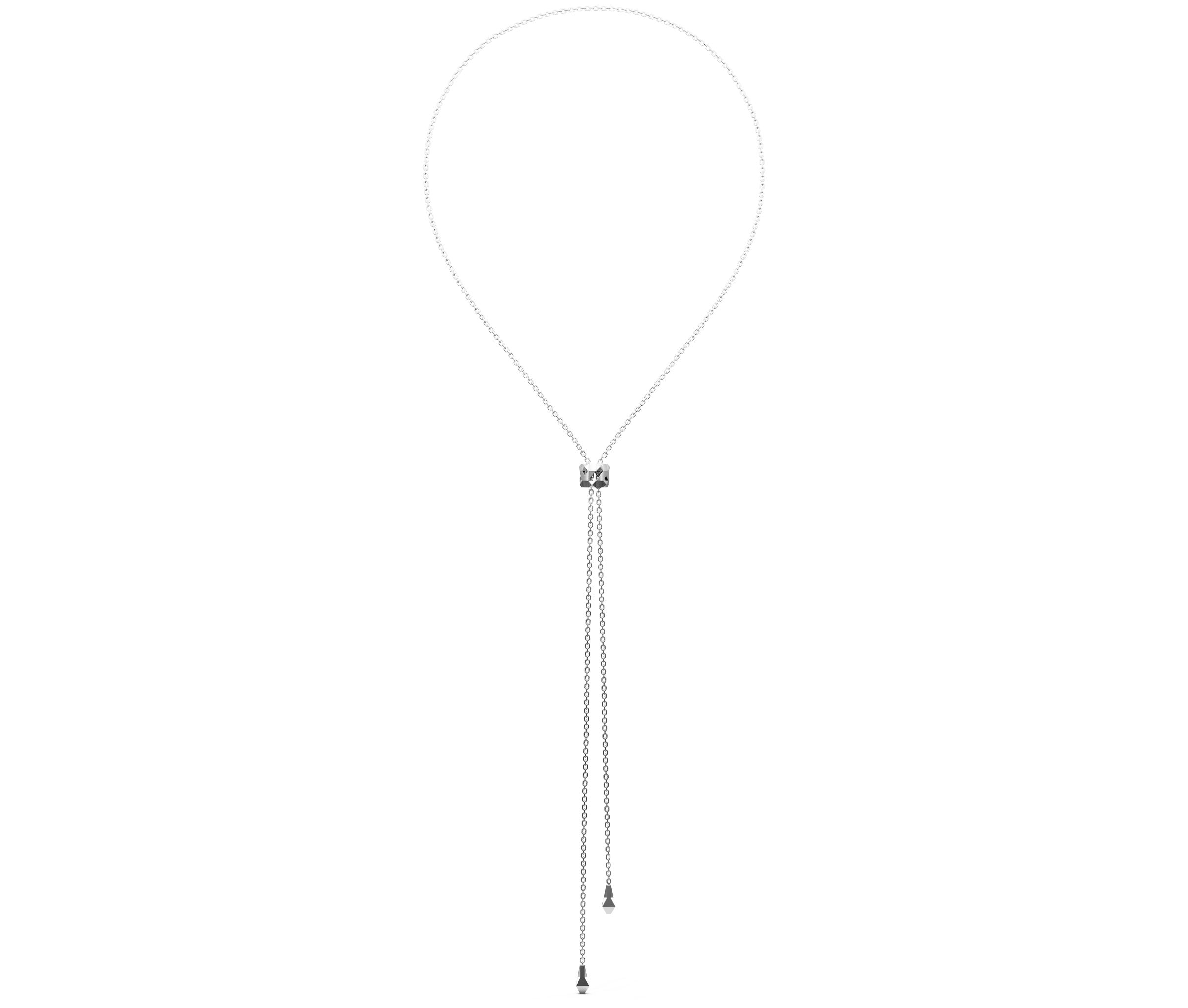 Its tie-inspired shape adds a refined structure to the piece, offering a clean, vertical line that draws the eye. The smooth, bead-like construction allows it to glide effortlessly along the chain, creating a look that’s both balanced and fluid. Designed for versatility, this piece brings quiet sophistication to everyday wear. A small detail that speaks volumes.