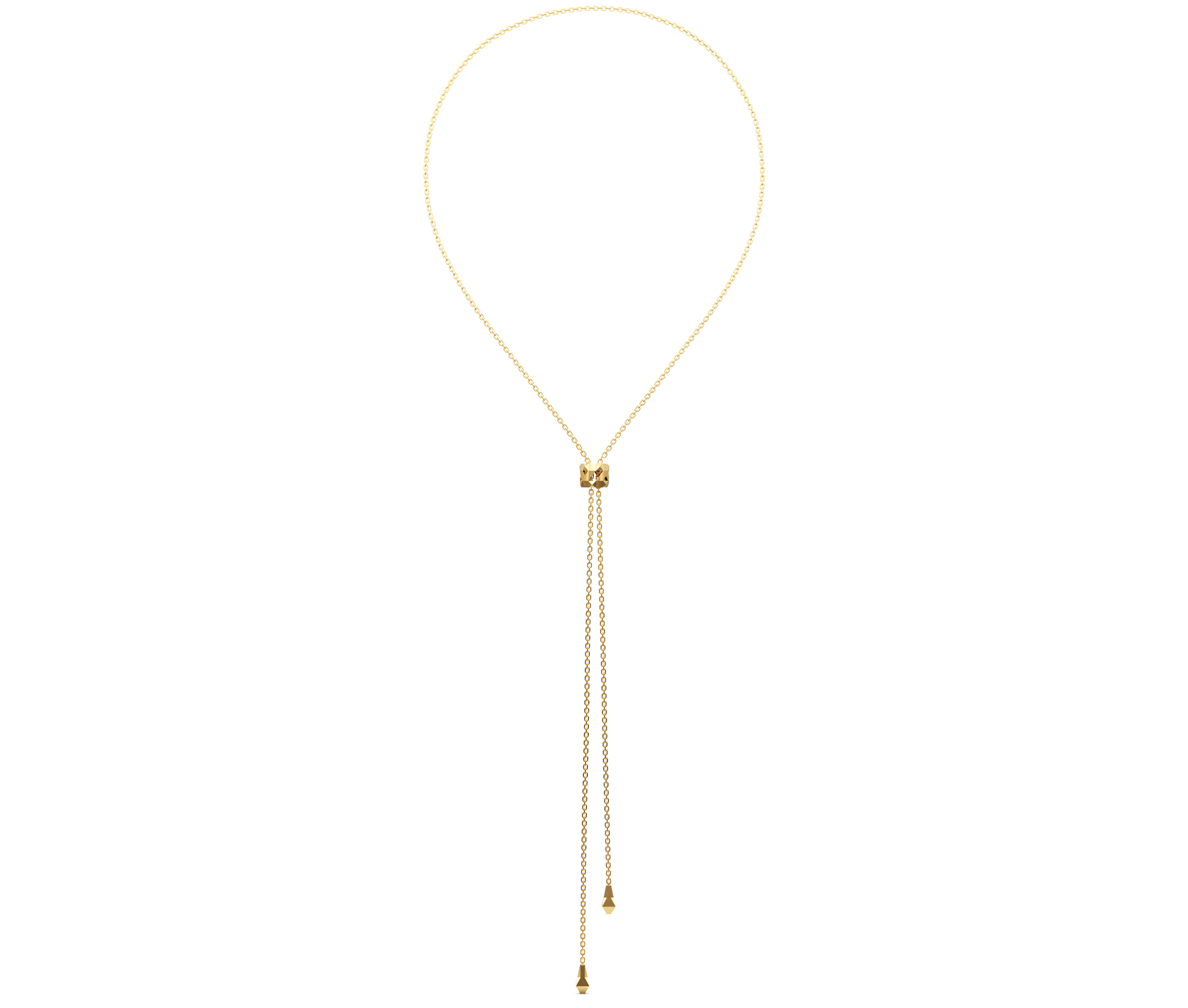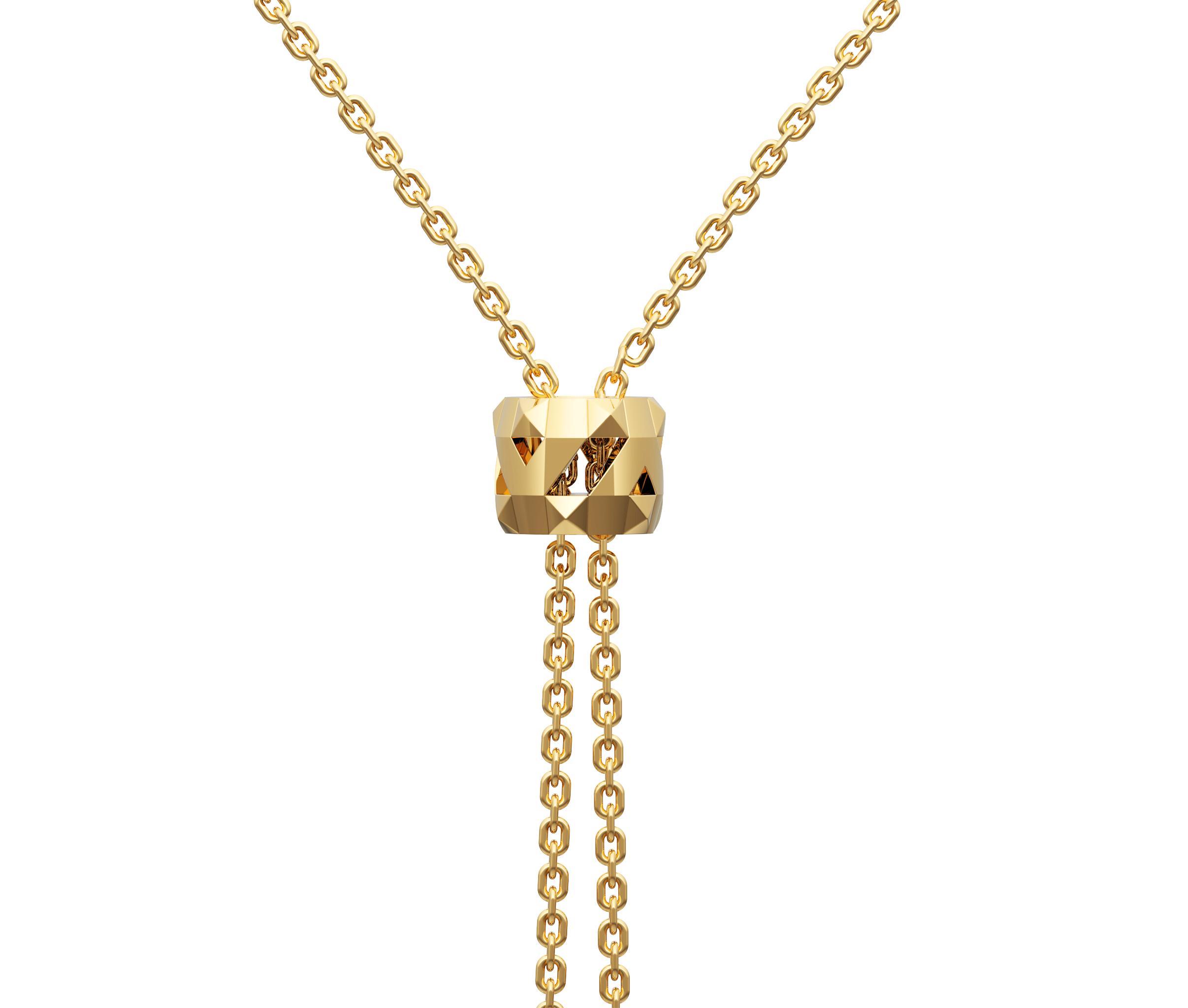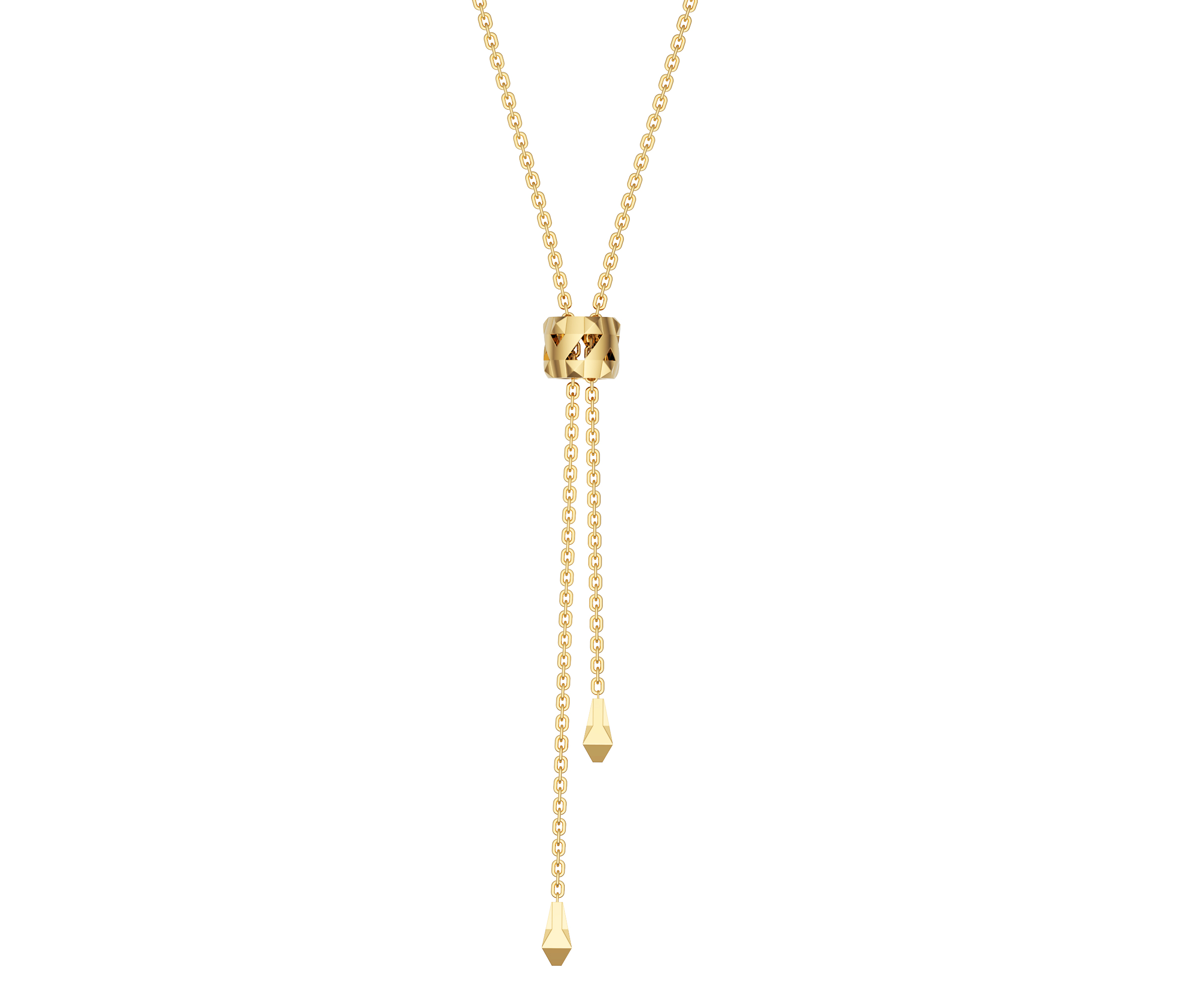 Its tie-inspired shape adds a refined structure to the piece, offering a clean, vertical line that draws the eye. The smooth, bead-like construction allows it to glide effortlessly along the chain, creating a look that’s both balanced and fluid. Designed for versatility, this piece brings quiet sophistication to everyday wear. A small detail that speaks volumes.
