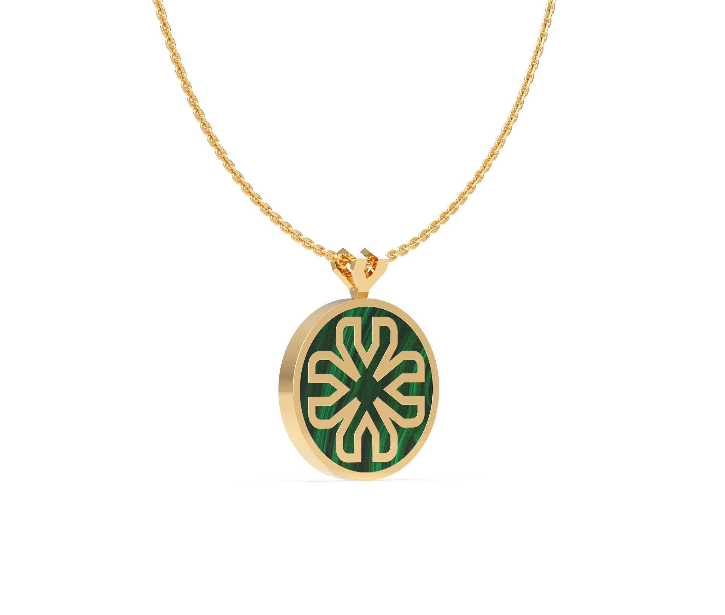 The Integrity Pendant is a bold yet refined piece, featuring an 18mm disc of rich malachite set in satin-finished 18K yellow gold. Its deep green tones and natural striations make each pendant unique, adding organic texture to the clean, circular form.